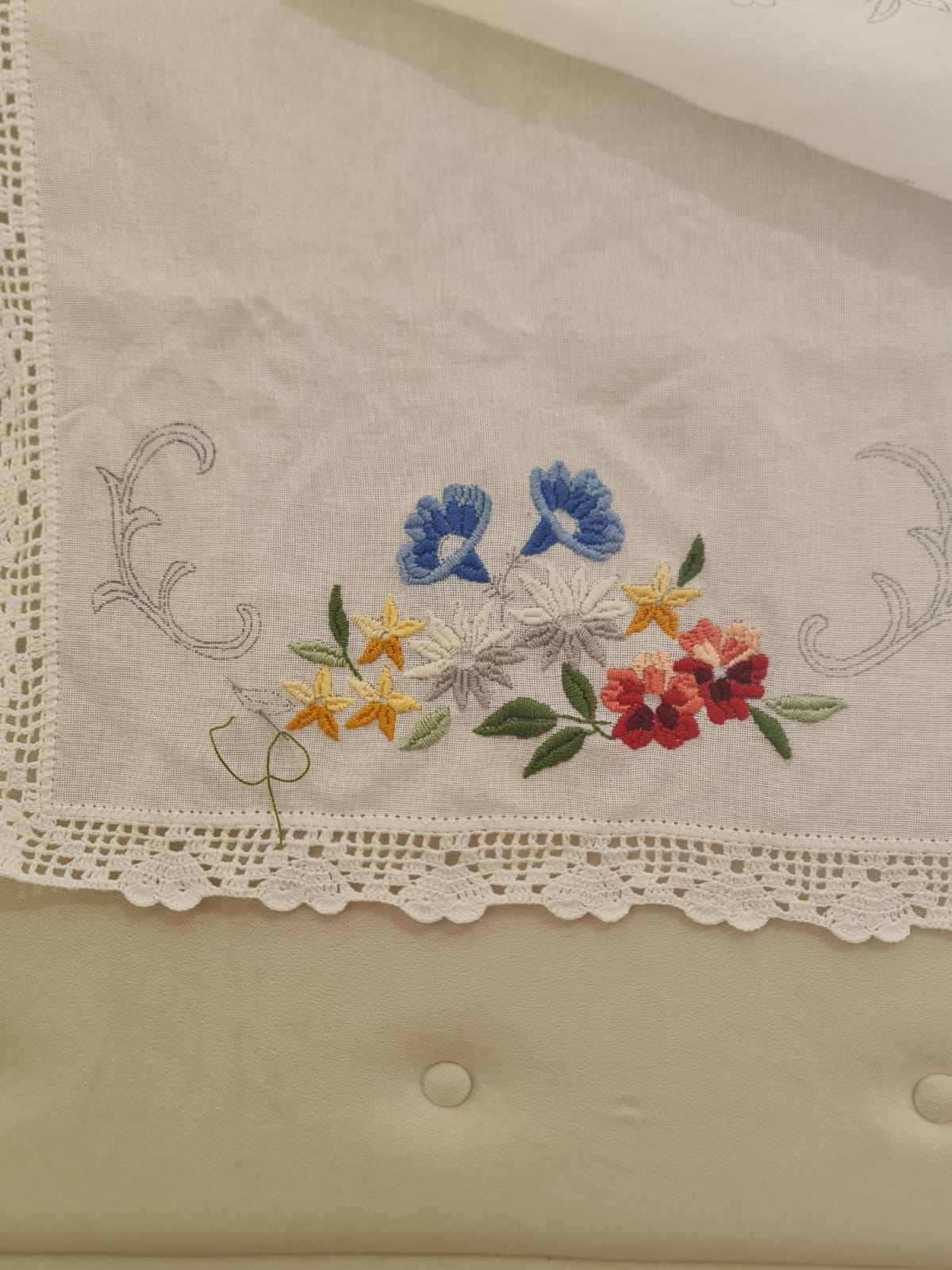 Encante sua mesa com a delicadeza desta toalha artesanal. Confeccionada em tecido de alta qualidade, possui bordados florais coloridos em tons de azul, vermelho e amarelo, que trazem alegria e sofisticação à peça. O acabamento em crochê feito à mão nas bordas adiciona um charme especial, tornando-a única e elegante.